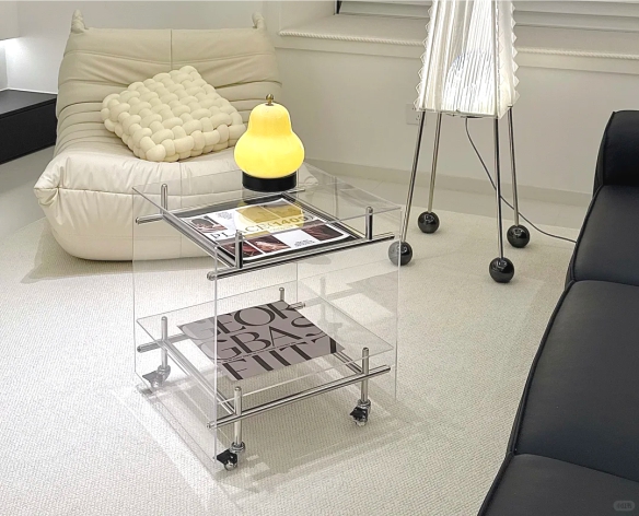 它的设计简约而不简单。透明或可定制颜色的亚克力板,在光影交错间呈现出独特的现代感,轻松融入各种家居风格。多层设计提供充足的收纳空间,无论是书籍、零食、遥控器,还是咖啡杯、绿植,都能井然有序。派对时,它是贴心的饮料推车;阅读时,它是安静的书籍伴侣;工作时,它是灵活的办公助手。